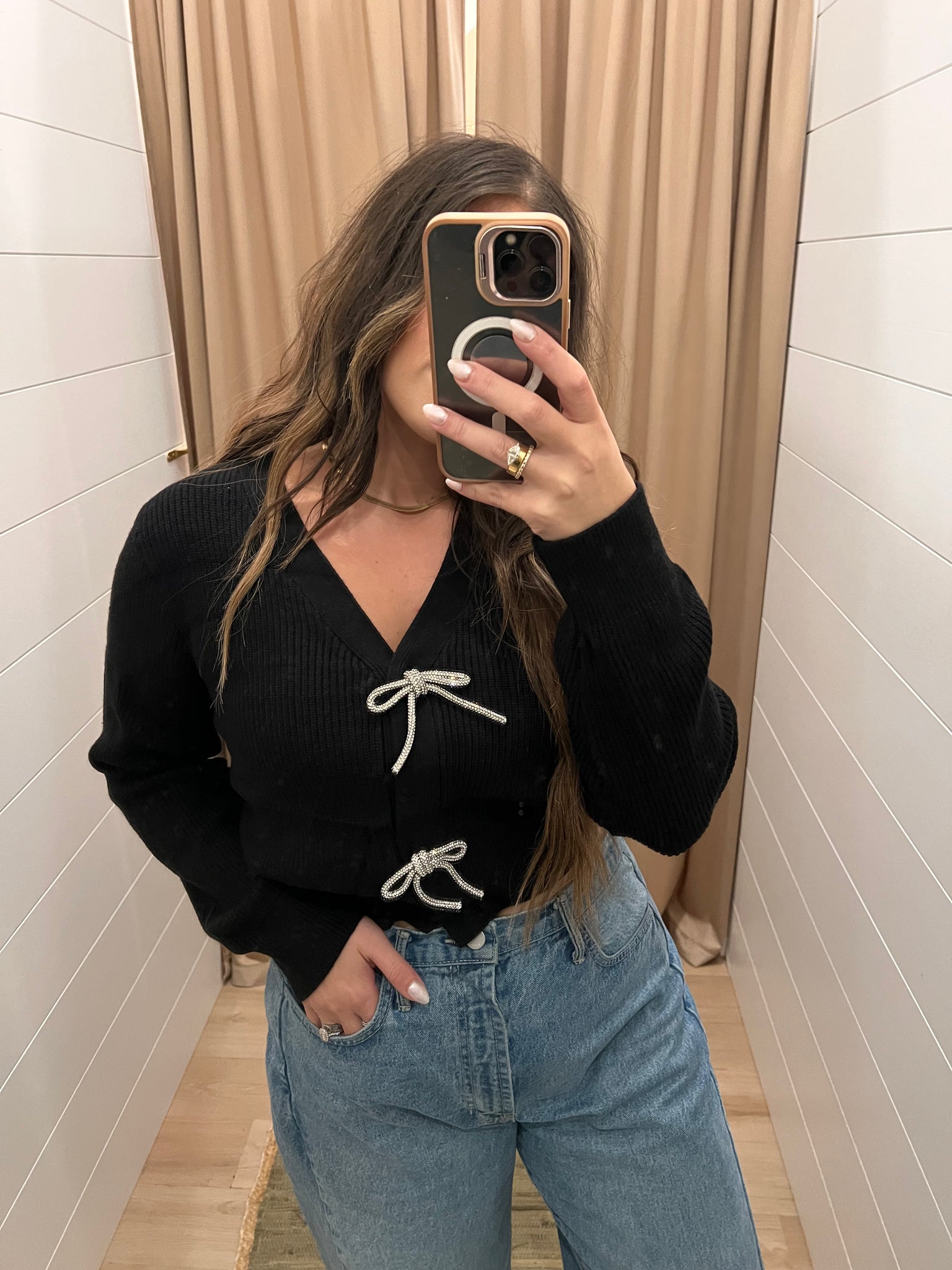 Sweet meets sophisticated in The Bella Bow Cardigan — a charming knit layer designed to add instant elegance to your everyday look. Featuring delicate jewel-encrusted bow details along the front, this cardigan sparkles with feminine flair while offering the cozy comfort of a soft, breathable knit.